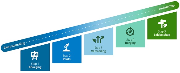 Aanvullend op de voorgaande drie stappen, verankert de Partij de toepassing van maatschappelijk verantwoord opdrachtgeven en inkopen verder in het eigen beleid en in de interne systemen of afspraken. De Partij zet in op het vergroten van de impact via inkoop. - Stap 5 Leiderschap